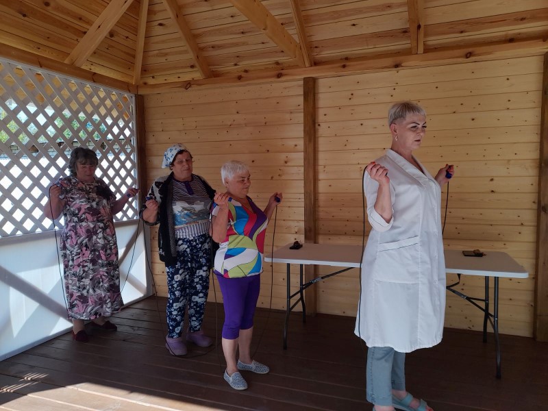 В отделении «Специализированный жилой дом для граждан пожилого возраста и инвалидов» состоялся фитнес час «На зарядку становись!».Фельдшер отделения Сенникова Е.Н. провела с участниками встречи фитнес час с использованием скакалок.