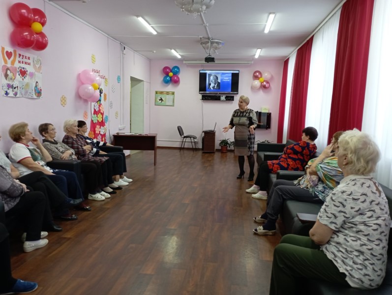 Для обслуживаемых отделения дневного пребывания Жарковой Т.И. провела литературную гостиную «Поэт от бога» о творчестве Расула Гамзатова. На мероприятии, посвящённом великому поэту современности, автору знаменитых «Журавлей», чьё творчество стало мировым достоянием, участники литературной гостиной познакомились с жизнью и творчеством поэта, раскрыли многообразие таланта Р. Гамзатова, осветили основные вехи творчества. А также посредством произведений раскрыли его любовь к Родине, красной нитью проходящую через все поэтическое наследие. Поэт Роберт Рождественский так сказал о Расуле Гамзатове... «Поэт он огромный, сделавший знаменитым и Дагестан, и аварский язык, и свои горы. Сердце его мудрое, щедрое, живое».