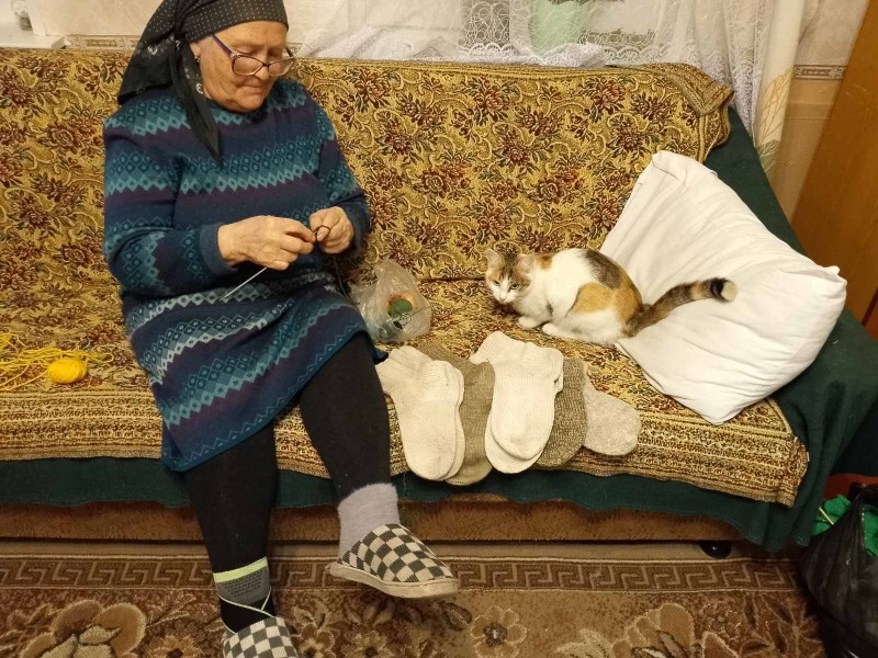 Обслуживаемая отделения социально-бытового обслуживания на дому №4 Соболева Е.С. вяжет теплые носки участникам СВО