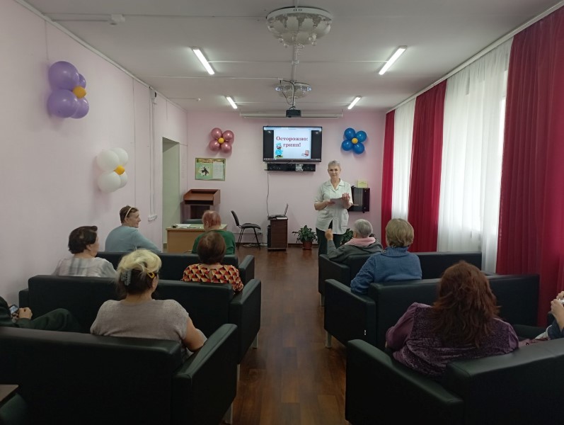 Важнейшей ценностью для человека является здоровье. Только здоровый человек может в полной мере стать творцом своей судьбы, добиться определённых успехов в карьере и личной жизни, продуктивно проводить свой досуг, быть создателем в окружающем его мире, поэтому в целях профилактики заболеваемости гриппом и ОРВИ медсестра Сенникова Е.Н. организовала и провела информационный час «Будь здоров!». Обслуживаемым дневного отделения ГБУ КЦСОН Краснобаковского муниципального округа напомнили о признаках заболевания гриппом и ОРВИ, мерах профилактики и необходимости витаминизации и вакцинации.