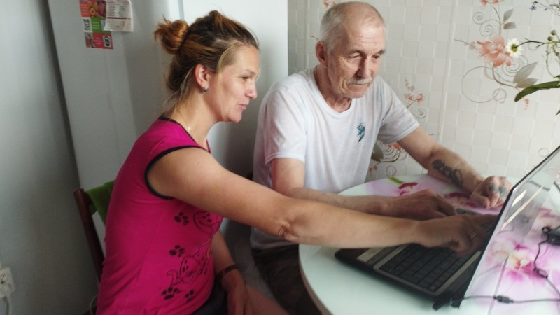 Социальный работник отделения социально-бытового обслуживания на дому №4 п. Шеманиха Воробьева Е.Ю. обучает основам работы за компьютером своего обслуживаемого