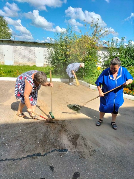 В отделении "Специализированный жилой дом для граждан пожилого возраста и инвалидов" продолжается работа по благоустройству территории. Сотрудники спецжилдома и жители вышли на территорию, вооружившись метлами, совками и граблями. Судя по боевому настрою и отличному настроению, все были готовы приложить усилия для того, чтобы территория вокруг Спецжилдома засияла чистотой.
