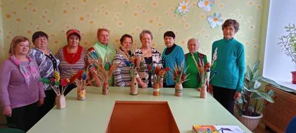 В Отделении дневного пребывания под руководством инструктора Науменко Т.В. на занятиях по трудотерапии обслуживаемые смастерили очень красивые поделки-букеты из шишек "Краски осени"