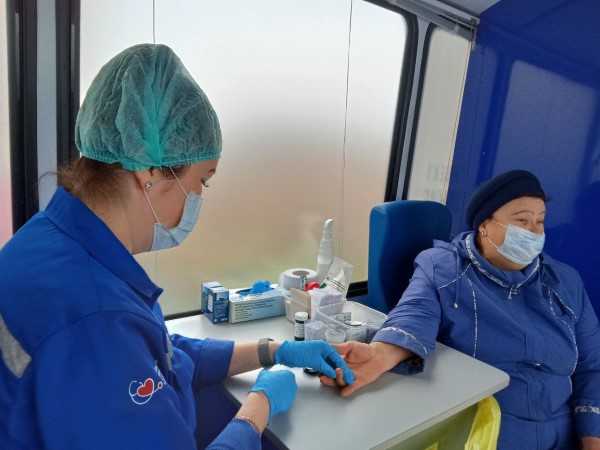 Жители с. Носовая вместе с социальными работниками отделения социально-бытового обслуживания на дому №3 принимают участие в обследовании своего здоровья в мобильно-диагностическом комплексе "Поезд здоровья"