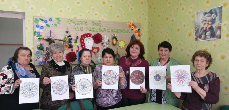 Психолог С.В. Алимова провела в Отделении дневного пребывания ГБУ «КЦСОН Краснобаковского муниципального округа» занятие по мандала-терапии – простому и эффективному методу, доступному даже для пожилых людей. Мандала-терапия позволяет работать с подсознанием, снимать напряжение и выражать чувства, способствуя саморегуляции и обретению внутренней гармонии. Участники создали собственные мандалы, дав им названия, а затем обсудили и интерпретировали свои работы. После занятия участники отметили улучшение настроения и снижение тревожности, а также выразили желание продолжать практику мандала-терапии дома.