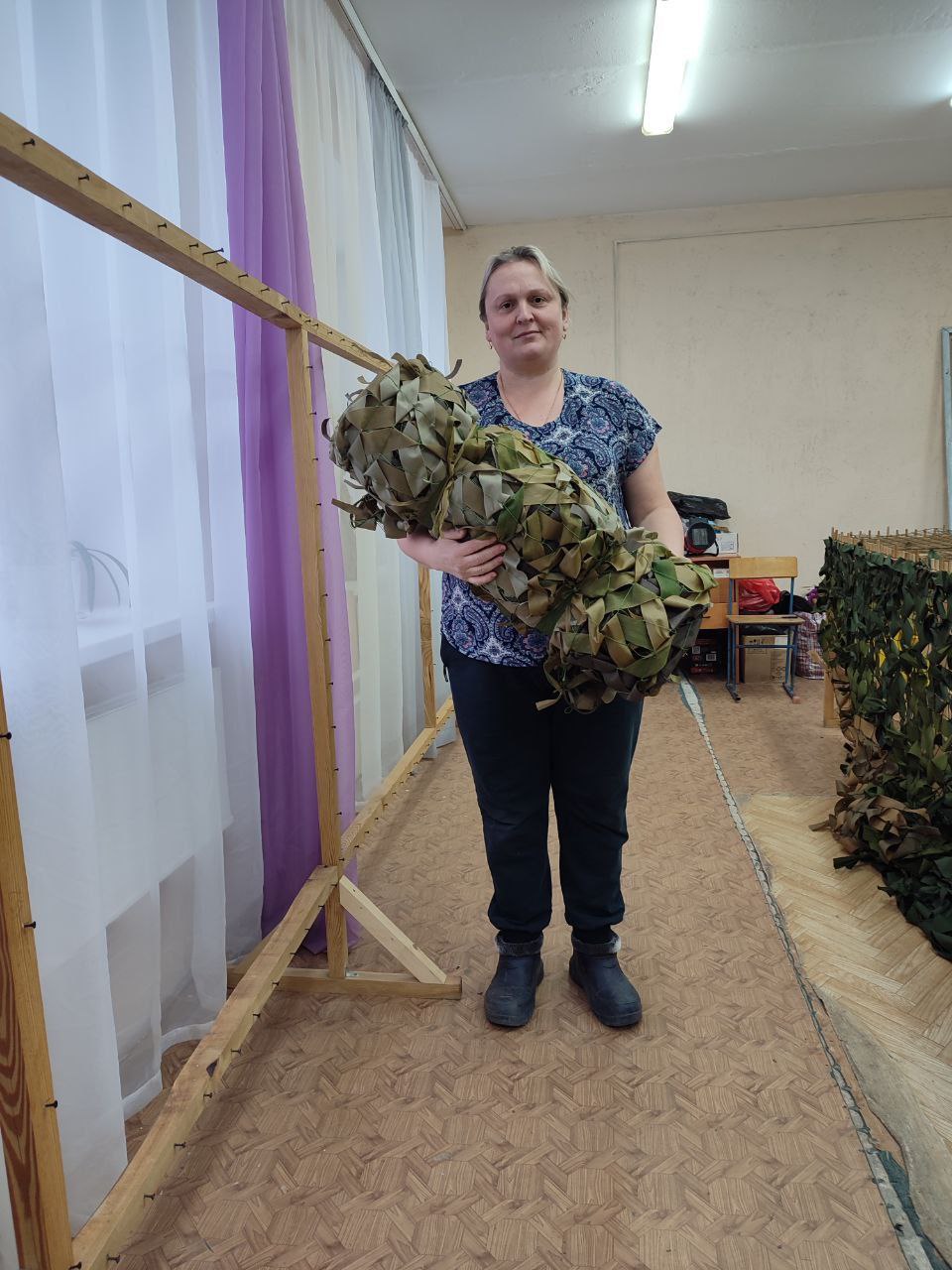 Социальные работники и специалисты ГБУ "КЦСОН Краснобаковского муниципального округа" изготовили ещё несколько маскировочных сетей для СВО. Приступили к плетению следующих сетей.