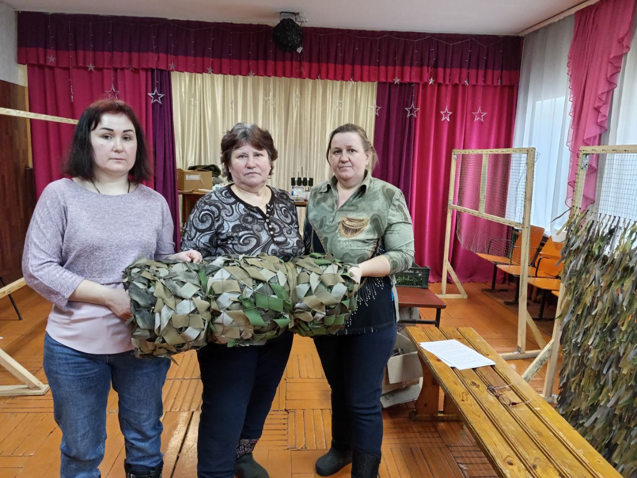 Социальные работники отделения социального обслуживания на дому с. Кириллово и сотрудники ГБУ "КЦСОН Краснобаковского муниципального округа" изготовили ещё две маскировочные сети для отправки в зону действия СВО
