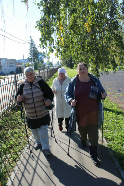 В отделении дневного пребывания с инструктором по трудовой терапии проводится занятия по освоению скандинавской ходьбы.