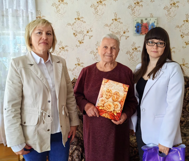Юбиляршу с этим прекрасным юбилеем поздравили начальник отдела по развитию Ужовской территории Светлана Валерьевна Перфильева и заведующая отделением СБО ГБУ КЦ СОН Починковского муниципального округа Татьяна Николаевна Дударева.