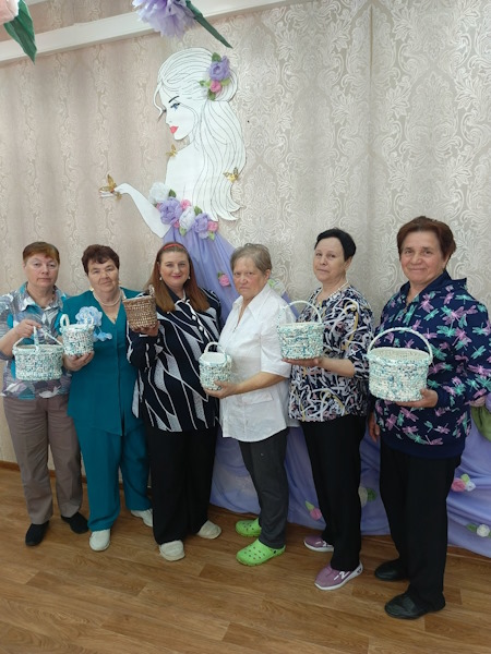 Отдыхающие отделения дневного пребывания на занятиях смастерили цветочное кашпо своими руками из ванных ковриков.