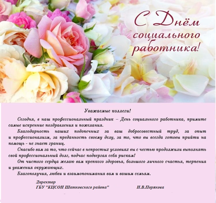 С праздником, уважаемые работники социальной сферы! На ваших плечах лежит ответственность за тех, кто нуждается в вашей помощи, в социальной защите. Именно вы улучшаете жизненные условия нуждающихся. Пусть же и в вашей жизни будет только хорошее и доброе. Счастья вам, крепкого здоровья и большого семейного счастья.
