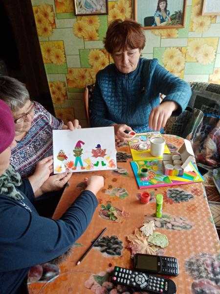 13.09.2022 года в отделении социально-бытового обслуживания на дому №2 с. Кержемок социальными работниками Натальей Говорухиной, Ларисой Горожанцевой, Еленой Ковлягиной, Еленой Нагановой проведено плановое занятие по креативному досугу с получателем социальных услуг Ниной Александровной Новиковой "Весёлые друзья", в ходе которого изготовили аппликацию из листьев и цветной бумаги.