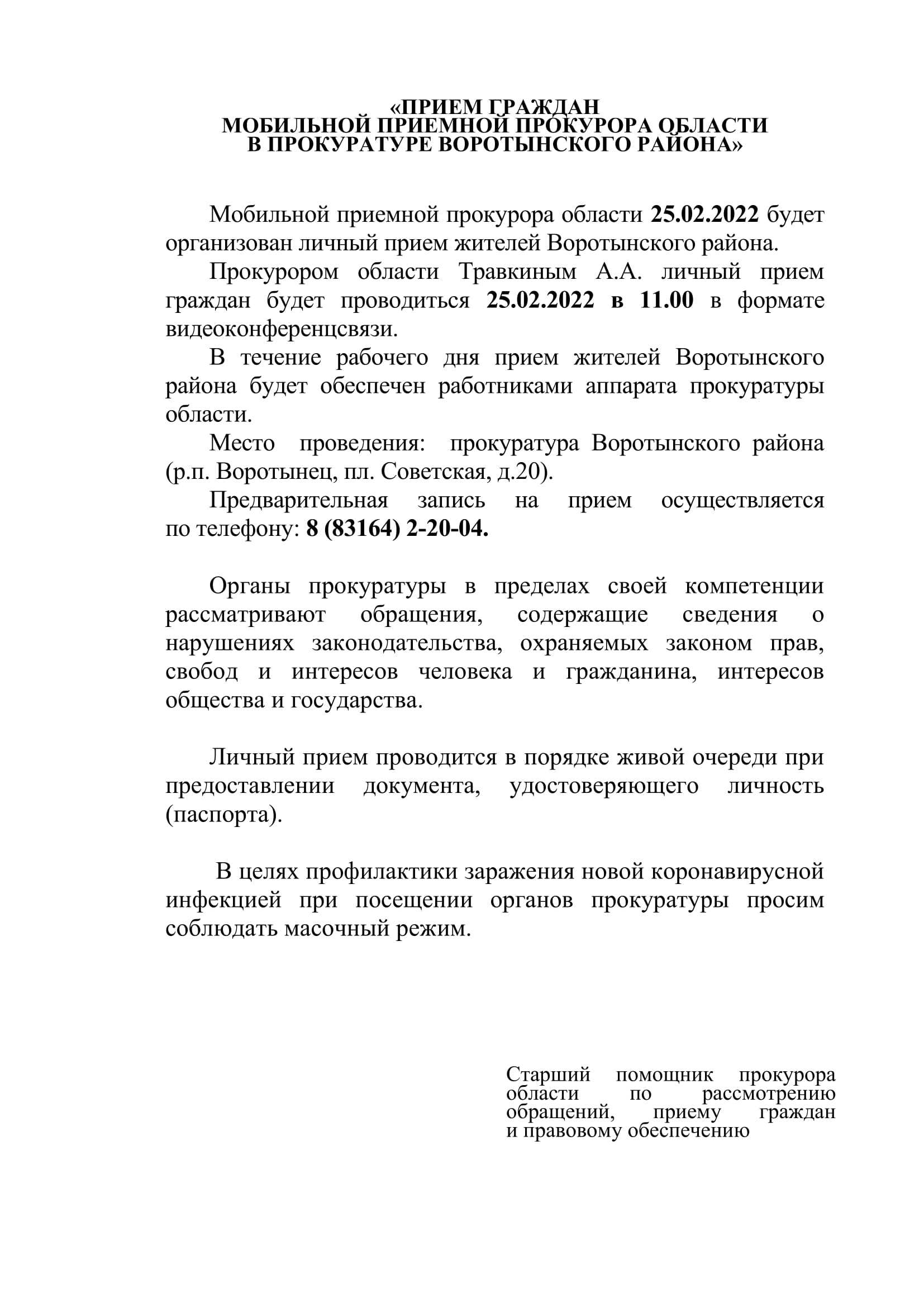 Мобильной приемной прокурора области 25.02.2022 будет организован личный прием жителей Воротынского района.